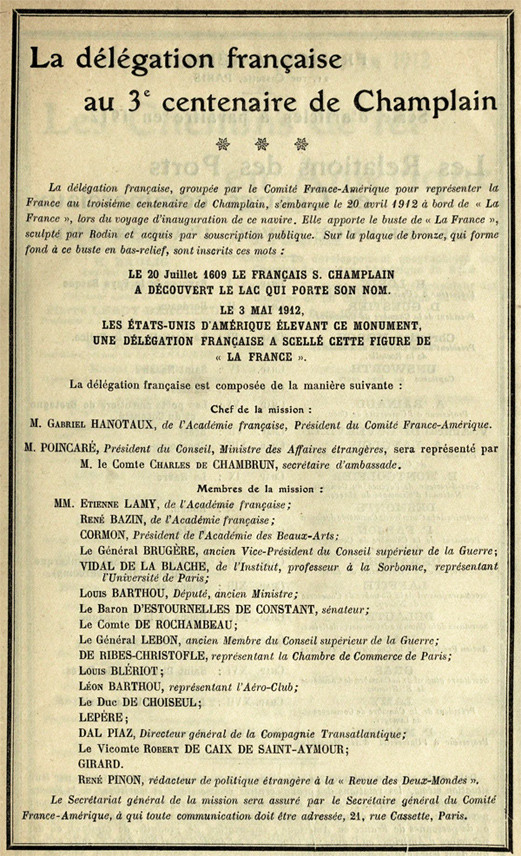 Il y avait à bord, les membres du comité «France-Amérique» qui se rendaient à Québec pour l'inauguration du monument de Champlain, Mrs. Gabriel Hanotaux, de l'Académie française, président du Comité France-Amérique, Léon Barthou, représentant l'Aéro-Club, M. et Mme Louis Blériot, M. D'estournelles de Constant, sénateur, M. Étienne Lamy, de l'Académie française, et les généraux Lebon, ancien membre du Conseil supérieur de la guerre et Michal.